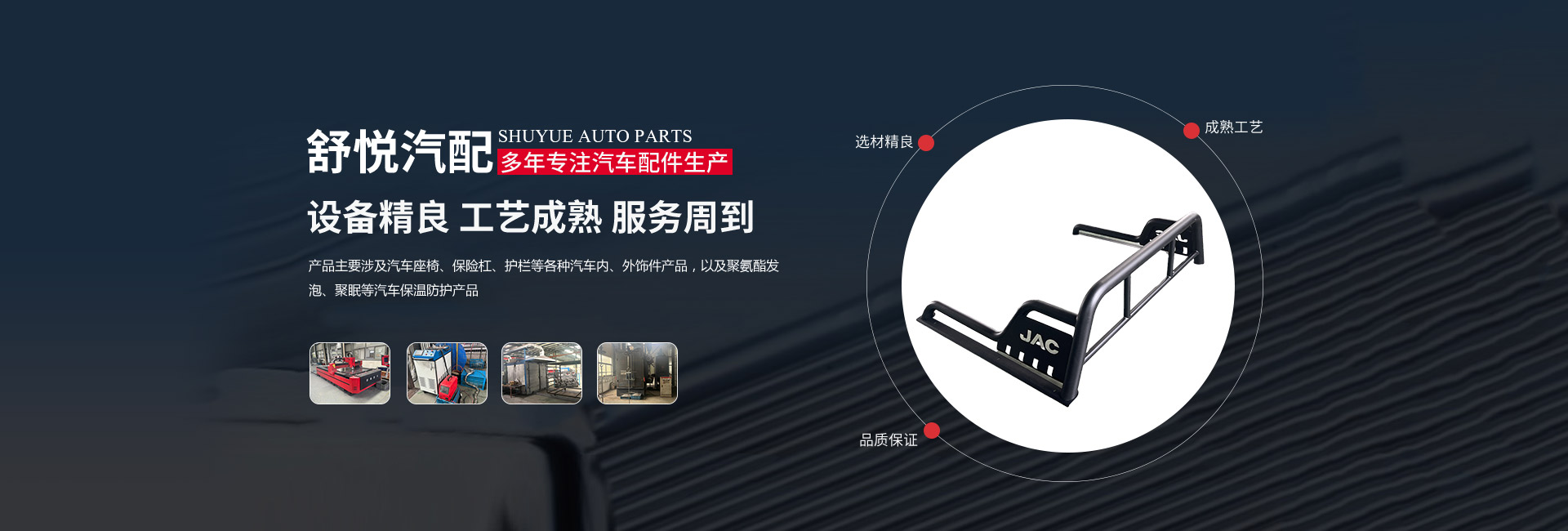 揚(yáng)州舒悅汽配有限公司經(jīng)過多年的穩(wěn)定發(fā)展,業(yè)績一直蒸蒸日上。公司產(chǎn)品主要涉及汽車座椅、保險(xiǎn)杠、護(hù)欄等各種汽車內(nèi)、外飾件產(chǎn)品,以及聚氨酯發(fā)泡、聚脲等汽車保溫防護(hù)產(chǎn)品。其主要是為江淮、金龍,奇瑞等公司服務(wù),已連續(xù)多年成為江淮、金龍等公司的A級供應(yīng)商。        公司成立于1997年,現(xiàn)坐落于揚(yáng)州市儀征劉集盤古工業(yè)集中區(qū)202號,公司占地面積26640平 方米,廠房建筑面積18512平方米。公司擁有先進(jìn)的制造設(shè)備、可靠的生產(chǎn)工藝、完善的檢測手段和科學(xué)的管理,在售前和售后服務(wù)中做到快速反應(yīng),應(yīng)急應(yīng)變,為客戶提供優(yōu)良產(chǎn)品和滿意服務(wù)。公司的產(chǎn)品開發(fā)能力和生產(chǎn)規(guī)模在同行業(yè)中處于前列的地位。        揚(yáng)州舒悅?cè)吮小罢\信雙嬴”的原則,發(fā)揚(yáng)“誠信、務(wù)實(shí)、創(chuàng)新、貢獻(xiàn)”的企業(yè)精神,恪守“顧客至上”的經(jīng)營宗旨,致精從業(yè),不斷引進(jìn)新技術(shù)、新材料。以優(yōu)良的產(chǎn)品、合理的價(jià)格和周到的服務(wù)參與市場競爭。公司愿與國內(nèi)外朋友建立真誠的合作伙伴關(guān)系,攜手共創(chuàng)輝煌!